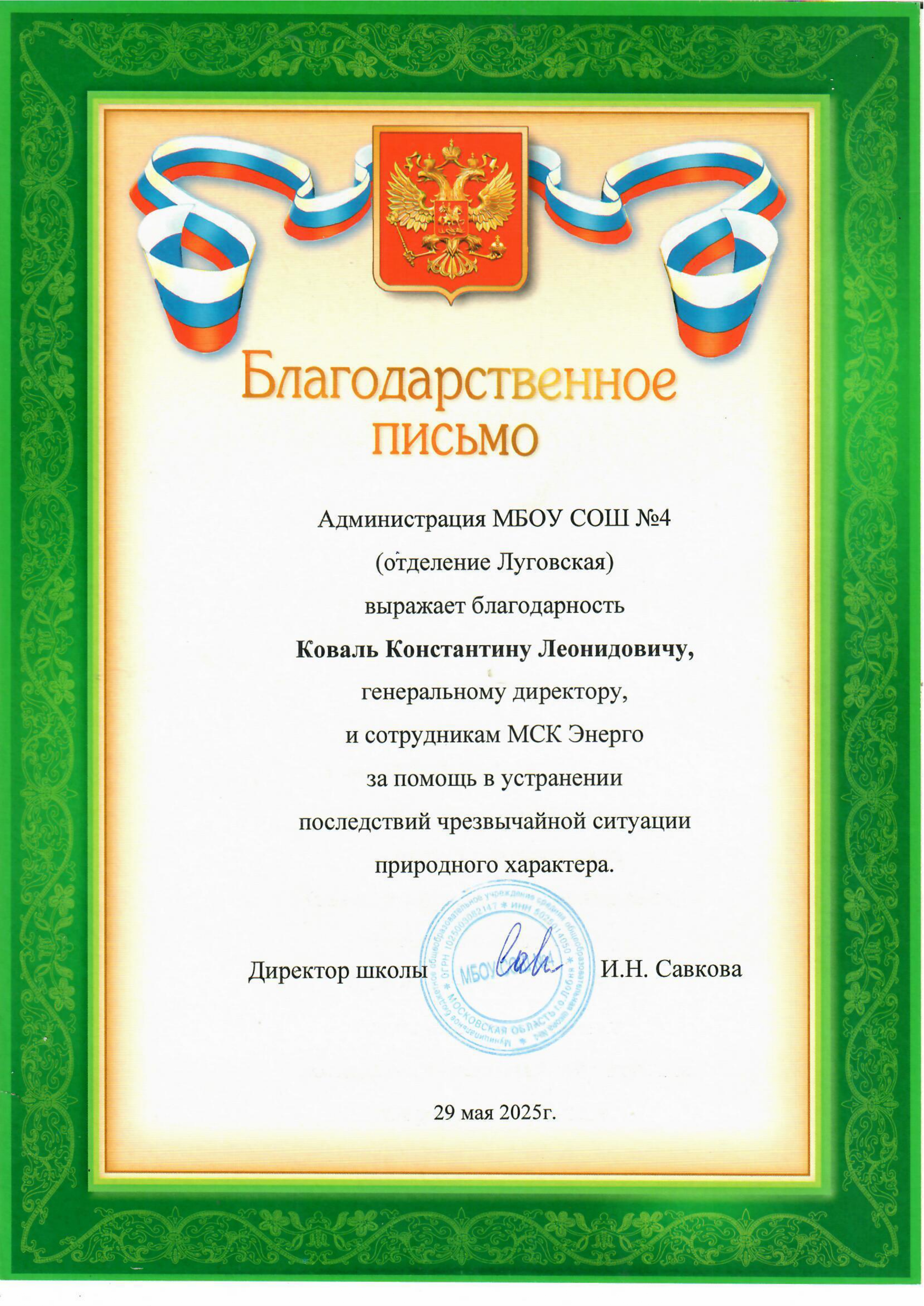 02/06/2025 В адрес АО «МСК Энерго» поступило благодарственное письмо от администрации Московского бюджетного образовательного учреждения средней образовательной школы № 4, отделение Луговская города Лобня, за помощь в устранении последствий чрезвычайной ситуации природного характера. Благодаря слаженной работе специалистов компании удалось оперативно восстановить подачу электроэнергии, что позволило избежать сбоев в учебном процессе. Директор учебного заведения И.Н. Савкова выразила признательность за профессионализм и отзывчивость сотрудников организации. Полученная благодарность – подтверждение важности работы компании АО «МСК Энерго». К списку новостей